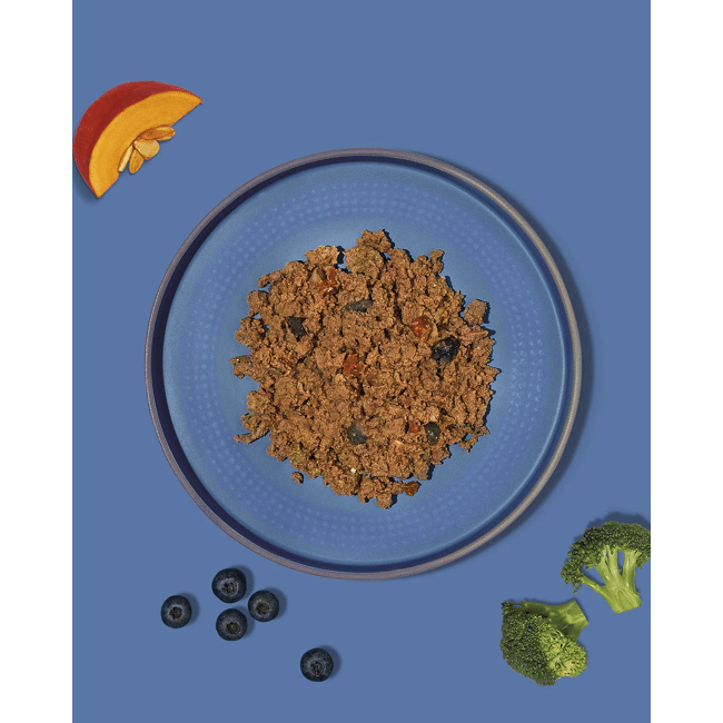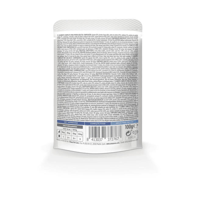 SAMENSTELLING: Lam 85% (verse lam 60%, lamsbouillon 25%), pompoen 5%, aardappeleiwit, aardappel 2%, veenbessen, mineralen, zonnebloemolie, lijnzaad 0,03%, inuline (bron van fructo-oligosachariden (FOS)) 0,02%, gehydrolyseerde gistcelwand (bron van mannanoligosachariden (MOS)) 0,02%, chondroïtine 200 mg/kg, broccoli 100 mg/kg, kelp 100 mg/kg, rozemarijn 100 mg/kg, kurkuma 100 mg/kg.