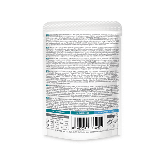 SAMENSTELLING: vers Iberisch varkensvlees 68%, wortel 2,20%, veenbessen 2%, mineralen, lijnzaad (natuurlijke bron van omega - 3 vetzuren) 0,03%, glucosamine 300 mg/kg, inuline (bron van FOS) 0,02%, gehydrolyseerde gistcelwand (bron van MOS) 0,02%, chondroïtine 215 mg/kg, laurier 100 mg/kg, kruidnagel, kurkuma 100 mg/kg.