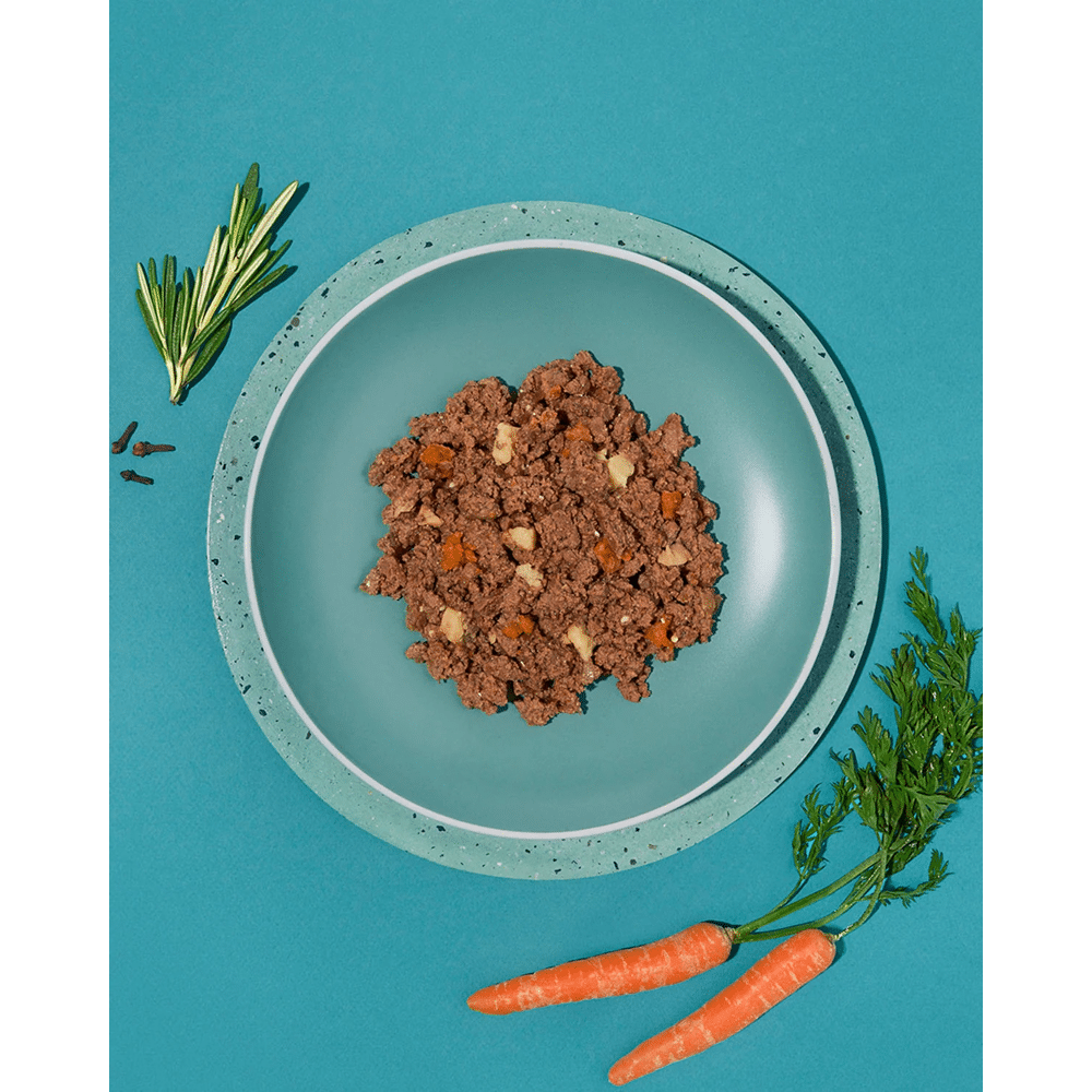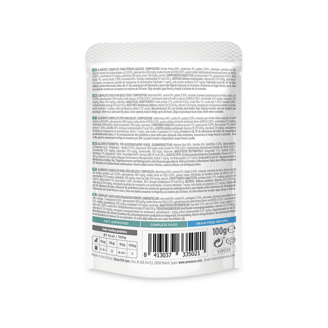 SAMENSTELLING: vers rund 64%, wortel 5%, aardappel 2,50%, mineralen, lijnzaad (natuurlijke bron van omega - 3 vetzuren) 0,03%, glucosamine 300 mg/kg, inuline (bron van FOS) 0,02%, gehydrolyseerde gistcelwand (bron van MOS) 0,02%, chondroïtine 215 mg/kg, goudsbloem 100 mg/kg, kruidnagel 100 mg/kg, rozemarijn.