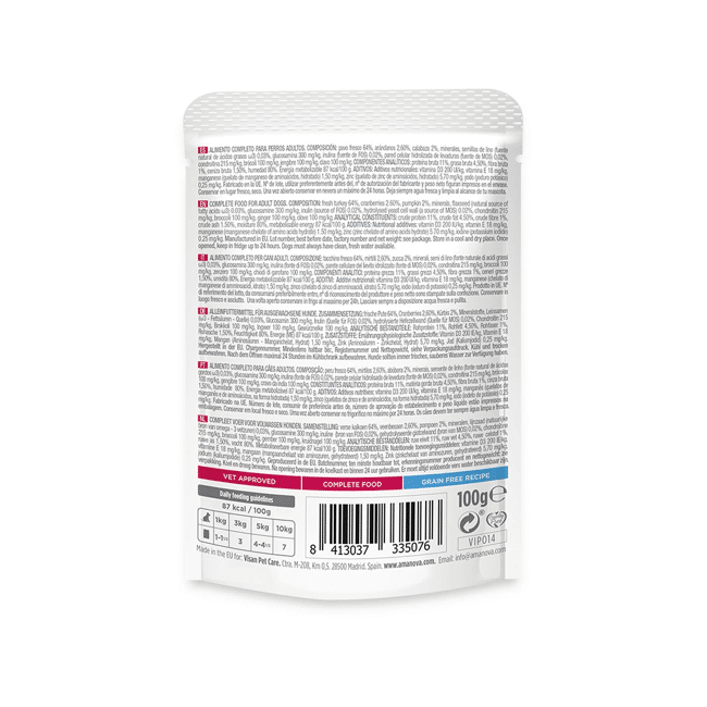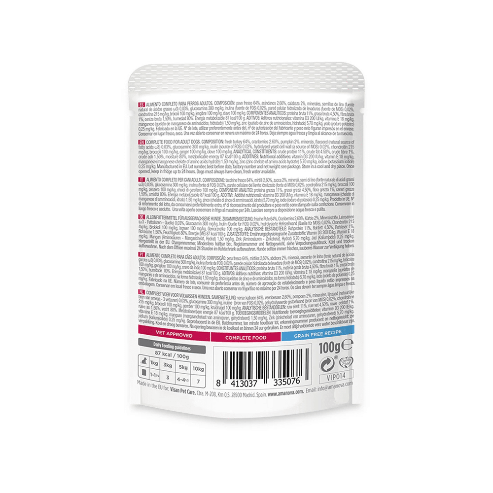 SAMENSTELLING: verse kalkoen 64%, veenbessen 2,60%, pompoen 2%, mineralen, lijnzaad (natuurlijke bron van omega - 3 vetzuren) 0,03%, glucosamine 300 mg/kg, inuline (bron van FOS) 0,02%, gehydrolyseerde gistcelwand (bron van MOS) 0,02%, chondroïtine 215 mg/kg, broccoli 100 mg/kg, gember 100 mg/kg, kruidnagel 100 mg/kg.