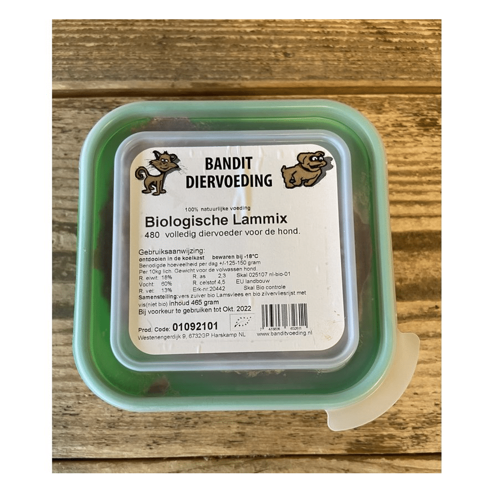 Biologisch lams spiervlees, biologisch lams orgaanvlees (pens, hart, lever, niertjes), gemalen biologische lamsribben, bio zilvervliesrijst, vis (niet bio).