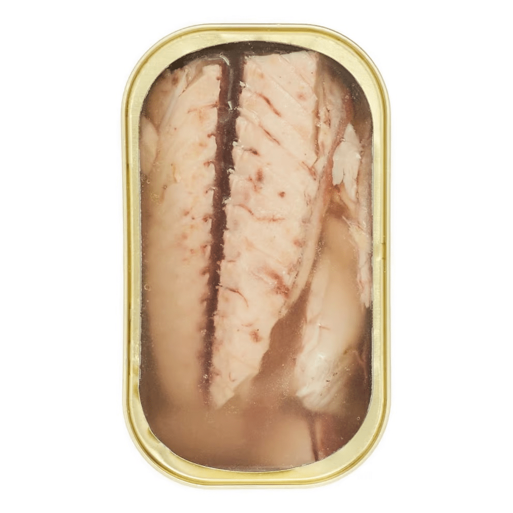 Makreelfilets in blik op waterbasis. Gevangen in de Atlantische oceaan voor de kust van Galicië (Spanje). Makreel is een blauwe vis die rijk is aan vitamine B12, B6 en B3 en heeft ook een hoog jodiumgehalte. Het is zeer gunstig voor het metabolisme en regelt energieniveaus en de celfunctie, daarnaast is het ook heilzaam voor de bloedsomloop. Makreel helpt bij de spijsvertering, om de schildklier goed te laten functioneren en is een geweldige antioxidant.