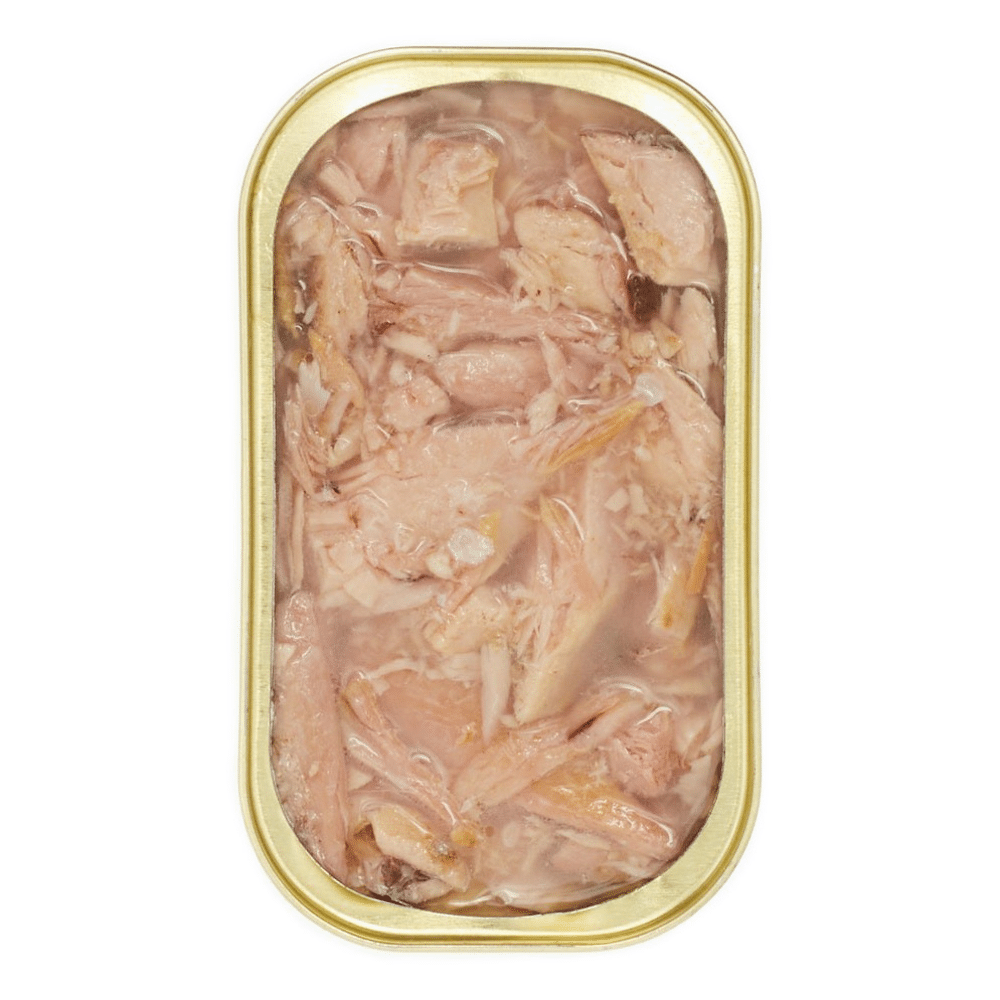 Geelvintonijn buikstukjes in blik op waterbasis. Gevangen in de Atlantische oceaan voor de kust van Galicië (Spanje). Geelvintonijn is een blauwe vis die 10 aminozuren en veel onverzadigde vetzuren bevat. Deze beschermen het hart, versterken de bloedsomloop en kunnen hartaandoeningen voorkomen. Het helpt ook om de bloeddruk te verlagen, de cholesterol op een gezond niveau te houden en draagt bij tot sterke botten.