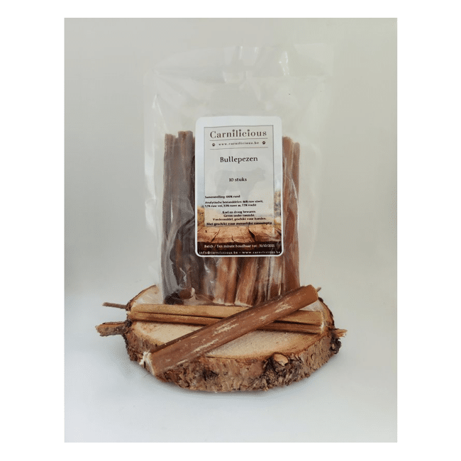 Bullepezen zijn overheerlijke, gedroogde snacks voor de hond. De snack bestaat uit 100% rund en bevat geen conserveringsmiddelen of andere onnodige chemische stoffen. De bullepezen zijn van super premium kwaliteit, hebben een harde textuur en hebben een doorsnede van +/- 1,5 à 2,5 cm.