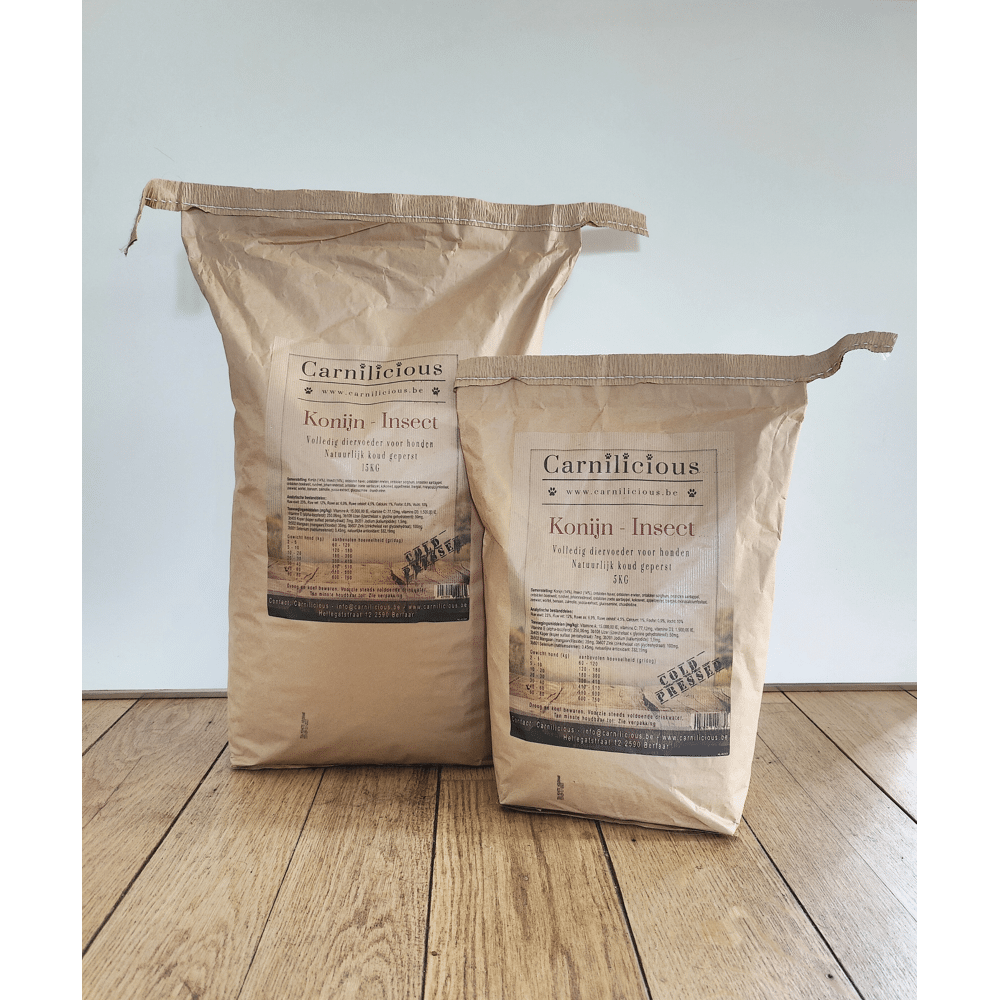 Carnilicious Konijn/Insect is een natuurlijk koudgeperste brok, geschikt voor honden van alle rassen.