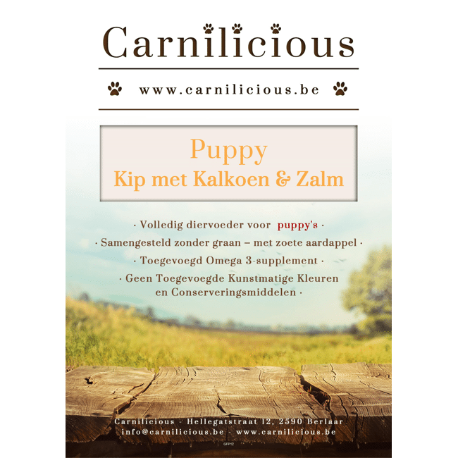Carnilicious Puppy met kip, kalkoen, zalm, zoete aardappel & wortel is een complete voeding voor pups.