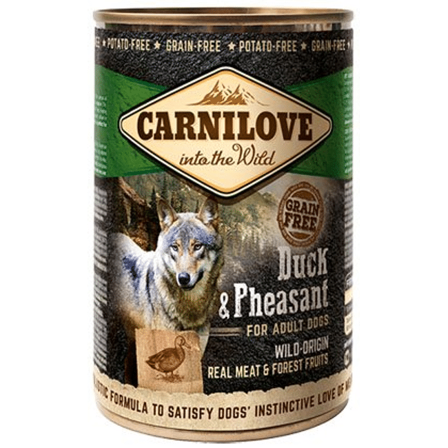Carnilove into the wild blikvoer voor volwassen honden met eend & fazant. Deze hoogwaardige complete blikvoeding bevat een hoog aandeel vlees en is volledig vrij van graan en aardappel.