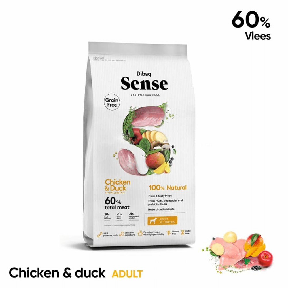 Dibaq sense kip & eend is een uitmuntende hypoallergene voeding geschikt voor volwassen honden van elk ras. Deze is gemaakt zonder granen wat de spijsvertering ten goede komt en allergieën voorkomt. Het verse kippen- en eendenvlees garandeert een optimale dosis proteïnen met minder vet, waardoor het voor een perfecte voedingsbalans zorgt en overgewicht voorkomt. Een heerlijk recept met vers fruit en verse groenten dat zorgt voor energie en vitaliteit, boordevol kwaliteit en smaak. Geschikt voor de meest veeleisende fijnproevers.