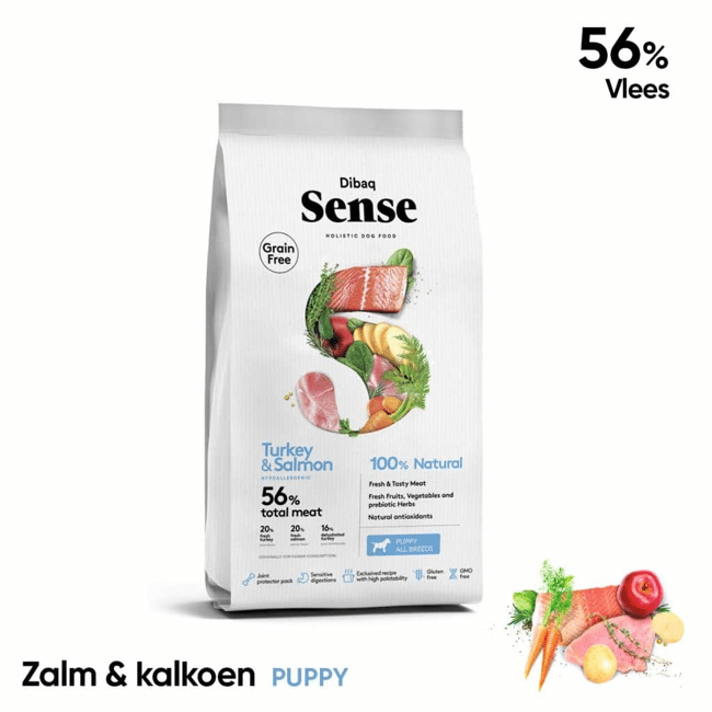 Dibaq sense kalkoen en zalm is een hypoallergene voeding speciaal gecreëerd voor puppy's (0-18 maand) en zwangere of zogende moeders. De perfecte combinatie van natuurlijke ingrediënten: vers kalkoenvlees, verse zalm, vers fruit en groenten (aardappel, zoete aardappel, erwten, wortel en appel) zijn samengevoegd om de groei optimaal te laten verlopen en de ontwikkeling te bevorderen. Natuurlijke ingrediënten voor gezonde puppy's.