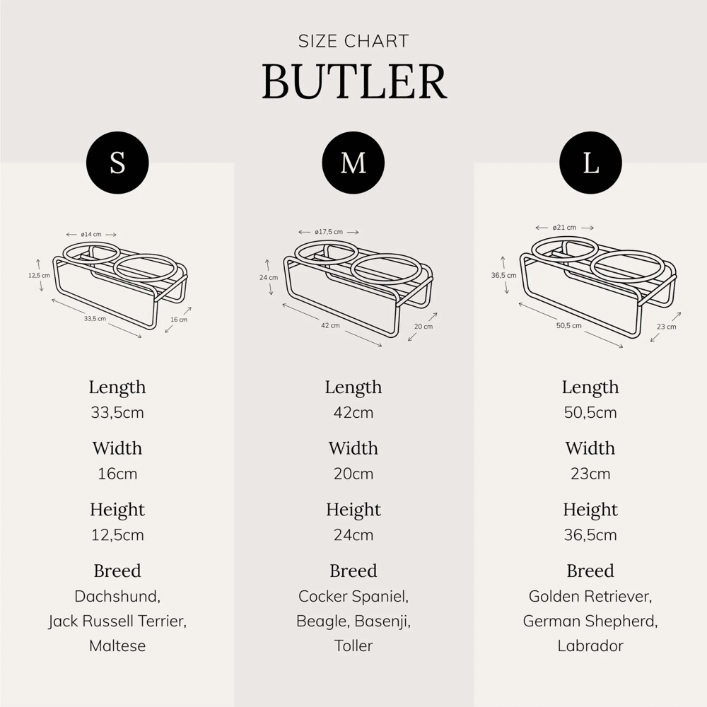 De voerbakstandaard BUTLER is ontworpen om te combineren met de District 70 BAMBOO voerbakken. De voerbakken van small tot large passen in het daarvoor geschikte standaard. Van de BAMBOO slowfeeder past alleen de kleinste maat Ø21 in de maat L van de voerbakstandaard. Overige combinaties met de slowfeeder zijn niet mogelijk.