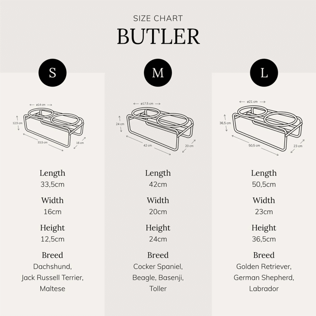 De voerbakstandaard is beschikbaar in drie verschillende maten. Maat S is geschikt voor kleine hondenrassen zoals een Teckel, Jack Russel Terriër en Maltezer. Maat M is geschikt voor middelgrote honden zoals een Cocker Spaniël, Beagle of een Toller. Maat L is geschikt voor grote honden zoals de Duitse Herder of Labrador.