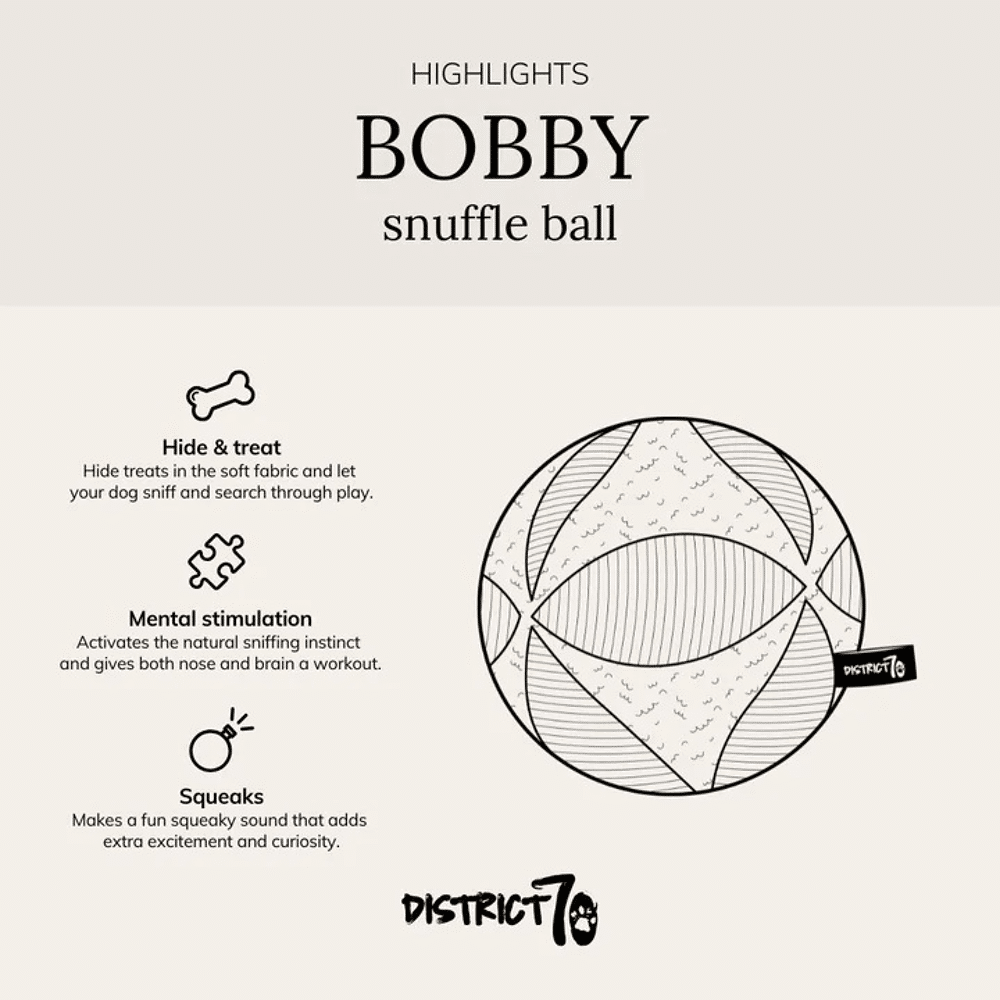 District 70 BOBBY combineert mentale stimulatie met stijlvol design. Dit speelgoed is ontworpen om het natuurlijke snuffel- en speurgedrag van honden te activeren. Door brokjes of snacks tussen de rib- en teddy-stof te verstoppen, biedt de bal zowel uitdaging als ontspanning. Ideaal als dagelijkse bezigheid of ter voorkoming van verveling.