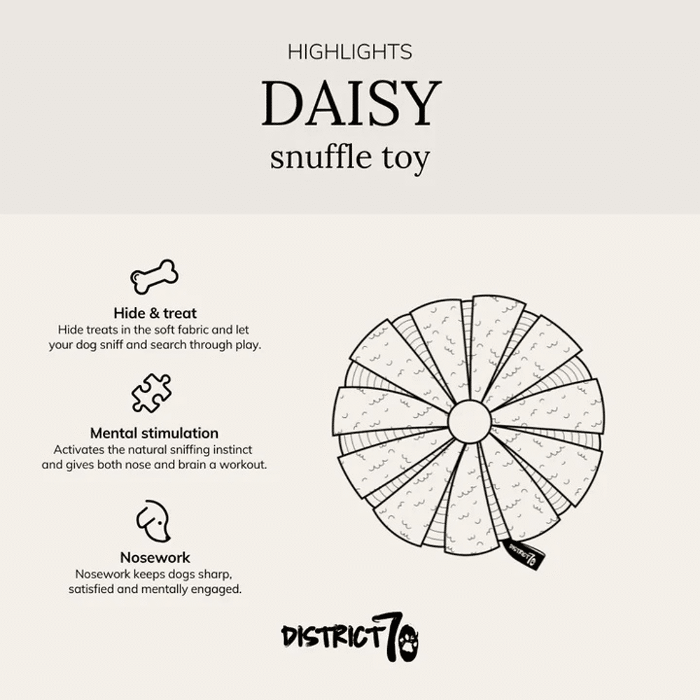 District 70 DAISY is een rond snuffelspeeltje dat mentale uitdaging en speelplezier combineert. Dankzij het slimme ontwerp met verstopplekjes tussen zachte stoffen, biedt dit speelgoed verrijking voor honden die graag hun neus gebruiken.