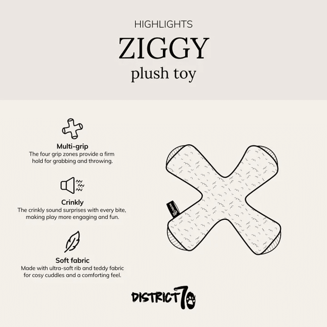 District 70 ZIGGY is een stijlvol en interactief hondenspeeltje dat knuffelzacht aanvoelt en tegelijkertijd de zintuigen prikkelt. Dankzij de combinatie van een pieper en knispermateriaal biedt ZIGGY afwisselend speelplezier voor honden van alle leeftijden en groottes.
