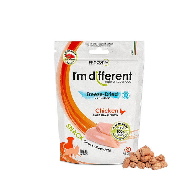 I'm Different Freeze Dried is een ideale, gezonde snack. Deze snack is geschikt voor honden met allergieën, voedingintoleranties en moeilijke eters.