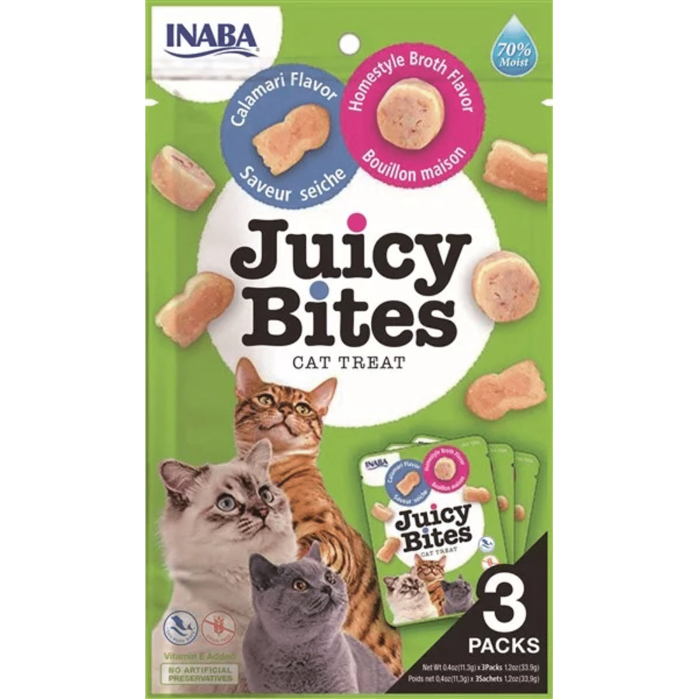 Juicy Bites zijn onweerstaanbaar vochtige, hapklare zachte tonijn- en kiplekkernijen gekruid met natuurlijke smaken, groene thee-extract en vitamine E. Zonder granen, bewaarmiddelen of kunstmatige kleurstoffen. Elk pakket bevat drie individuele traktatiepakketten om maximale versheid te behouden en elk traktatiepakket heeft twee leuke vormen in twee verschillende smaken om katten tevreden te houden.