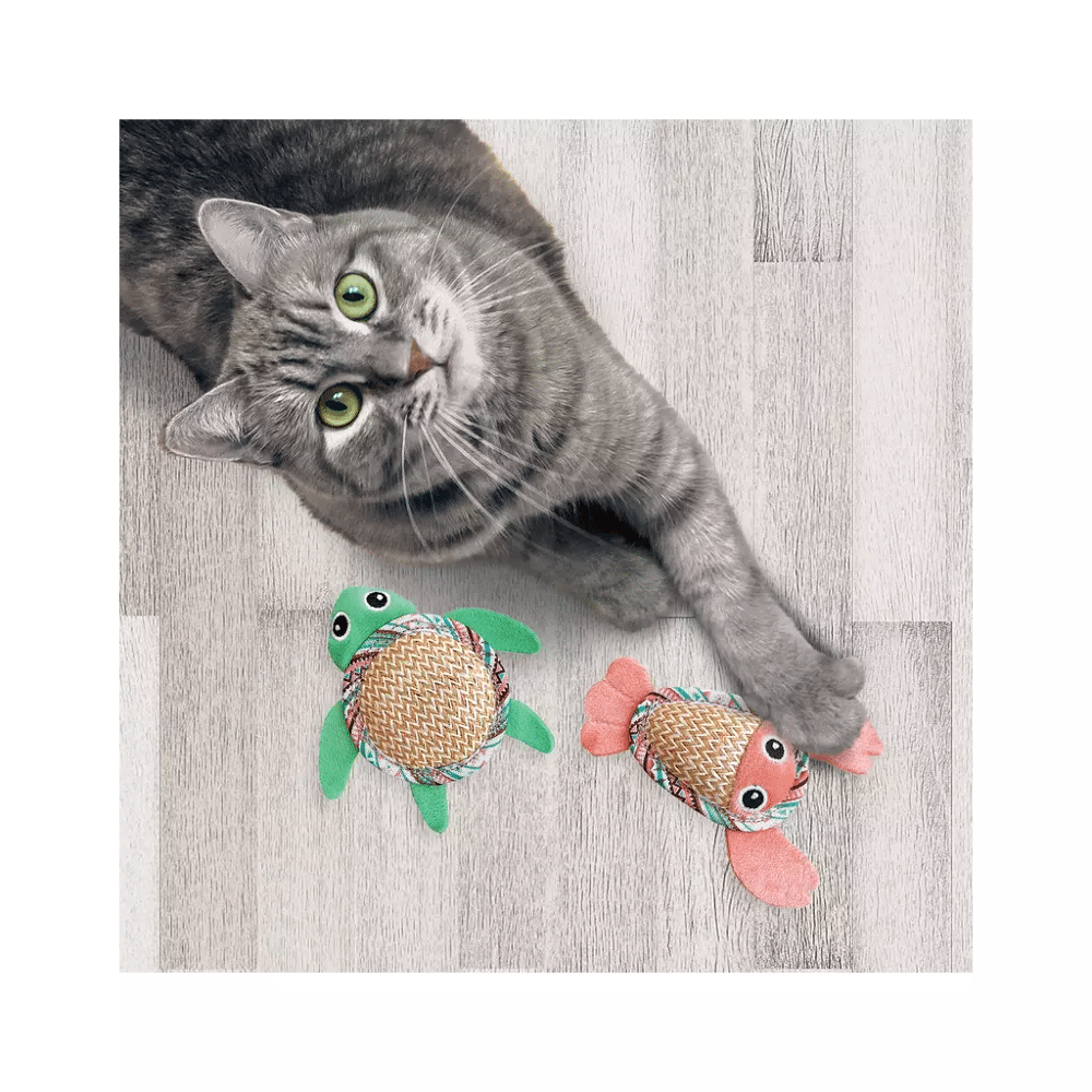 KONG Tropics Pals zwemmen zich een weg naar de pootjes van je kat en blijven een tijdje spelen! De kriebelende visgraatschelpen van tweedvezel zijn perfect voor kattenklauwen en bijten, terwijl zacht pluchen materiaal uitnodigt tot knuffelen. Premium Noord-Amerikaanse kattenkruid sprinkles en krakend binnenmateriaal in deze zoutwater wezens stimuleert de zintuigen en daagt het jachtinstinct uit. Dit multisensorische speeltje houdt de aandacht van je kat vast met zijn verschillende leuke functies.