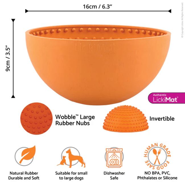 Deze likmat is een uitstekende slow feeder die mentale stimulatie bevordert en helpt om stress en angst te verminderen. Voor extra variatie kan de Wobble omgekeerd gebruikt worden of ingevroren worden voor langdurig speelplezier.