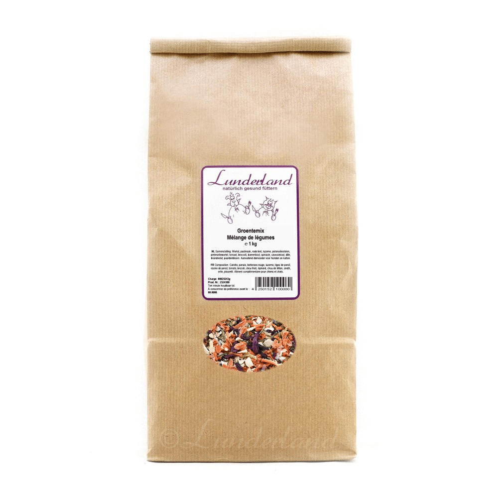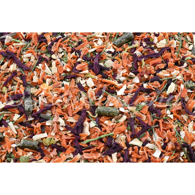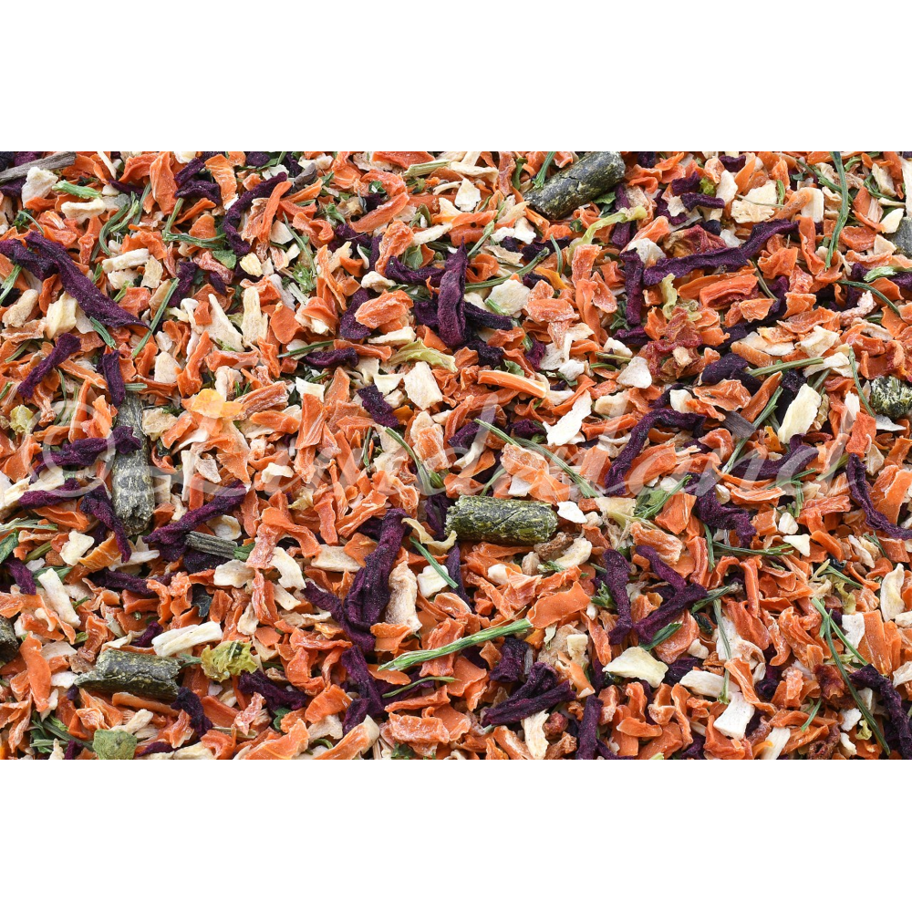 Een mix van gezonde groenten en kruiden. Deze mix is ideaal voor de normale dagelijkse voeding van honden en katten. De inuline uit de pastinaak en de oligosachariden uit de wortel dienen als voeding voor het darmmicrobioom en voeden het darmslijmvlies. Als bron van carotenoïden zijn wortelen extreem gezond – met name voor de ogen, de huid en het hart. Carotenoïden zijn secundaire plantaardige stoffen. Naast hun provitamine A-activiteit hebben wortelen een positief effect op het immuunsysteem. Ze hebben ook een antioxiderende werking in het lichaam (bescherming tegen ontstekingsstoffen). Peterselie heeft een positief effect op de gezondheid van de blaas. Alfalfa reguleert de bloedsuikerspiegel en levert waardevolle vezels. Tomaten leveren vitamine C, kalium en andere plantaardige stoffen. Ze hebben ook antioxiderende eigenschappen. Broccoli versterkt het immuunsysteem en levert veel waardevolle vitaminen. Spinazie en rode biet bevatten, naast vitamine K en bètacaroteen, ook grote hoeveelheden mineralen zoals ijzer. Kool is een echte krachtpatser. Een koning in mineralen- en vitaminevoorziening. Dille ondersteunt de spijsvertering. Brandnetel en paardenbloem ondersteunen de lever- en nierfunctie.