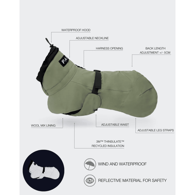 De lichtgewicht 3M™ Thinsulate™ isolatie zorgt voor warmte en is gemaakt van 78% gerecyclede materialen. De voering van de wolmix zorgt voor extra warmte, zelfs als het nat is. Het kenmerkende reflecterende materiaal garandeert zichtbaarheid en veiligheid tijdens buitenavonturen, terwijl de 100% waterdichte stof met getapete hoofdnaden uw hond droog houdt. Meerdere afstelpunten zorgen voor de perfecte pasvorm voor alle honden.