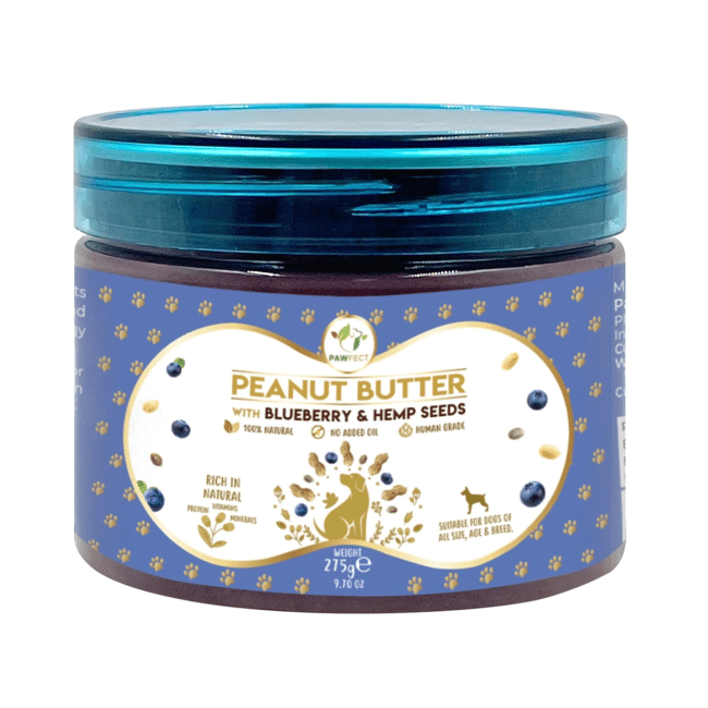 - Pawfect PEANUT BUTTER met Blauwe Bessen & Hennepzaad 275 gr