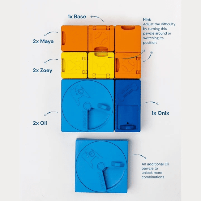 De Rainbow Set is voorzien van mechanismen om snoepjes te verbergen, zoals schuiven, deksels optillen en draaien, waardoor de hond wordt aangemoedigd om zijn natuurlijke jachtinstinct te gebruiken om verborgen snoepjes te vinden. Door de gele en oranje pawzles (Maya en Zoey) in verschillende richtingen te draaien, kun je de moeilijkheidsgraad van het speelgoed aanpassen