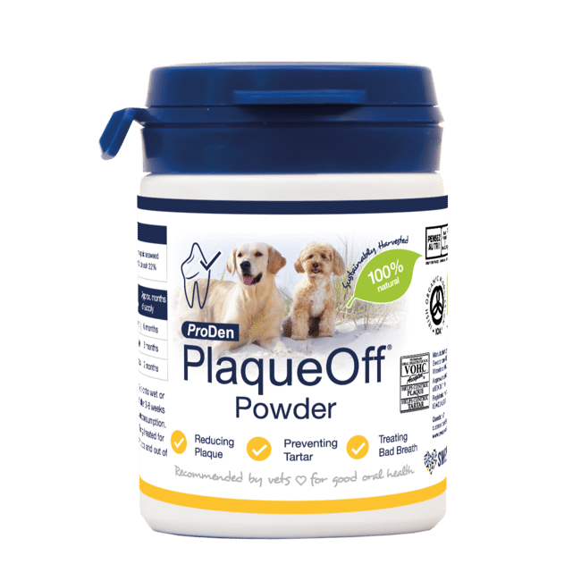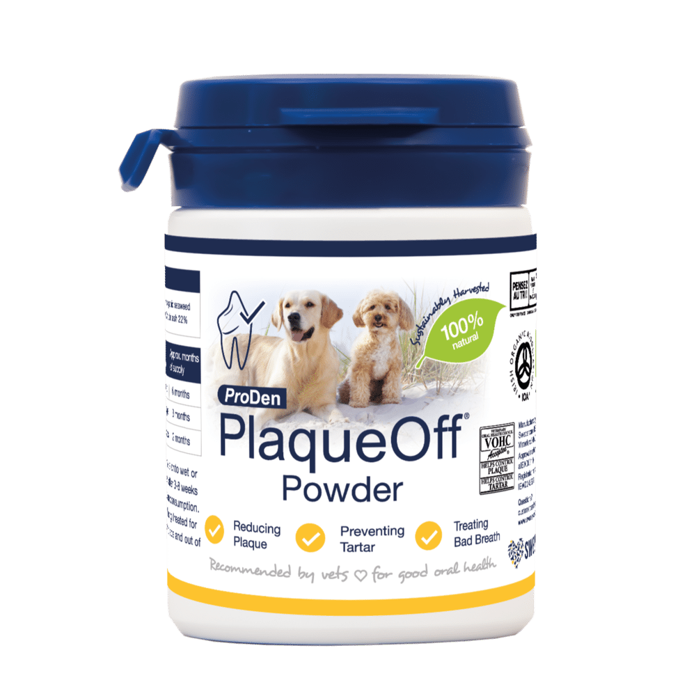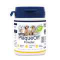 PlaqueOff is een biologisch en 100% natuurlijk poeder. Strooi het eenmaal daags over droog- of natvoer voor een frisse adem en vermindering van tandplak. PlaqueOff® maakt bestaand tandsteen zachter, waardoor het makkelijker is te verwijderen, en voorkomt nieuw tandsteen.