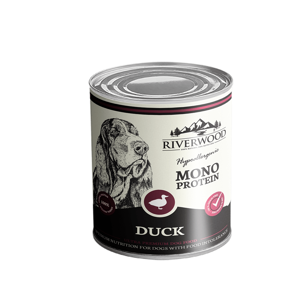 Riverwood mono-proteïne eend is natvoer dat uitsluitend eiwitten uit eend bevat. Dankzij deze enkele eiwitbron is het bijzonder geschikt voor honden met een voedselintolerantie of -allergie en kan het ook perfect worden ingezet bij een eliminatiedieet.