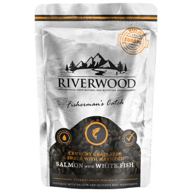 Riverwood hondensnack Crunchy Grainfree Fisherman's Catch is een volledig graanvrije hondensnack. Een overheerlijke en gezonde krokante snack met zalm en witvis als dierlijke eiwitbron. Verpakt in een hersluitbaar zakje van 200 gram.