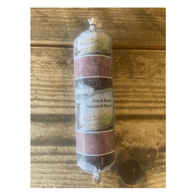 Samenstelling: 29,7% kippenkarkas,17,1% kippenvlees, 28,6% rundvlees 5,7% runderlong, 5,7% pens, 5,7% runderhart, 5,7% runderlever.