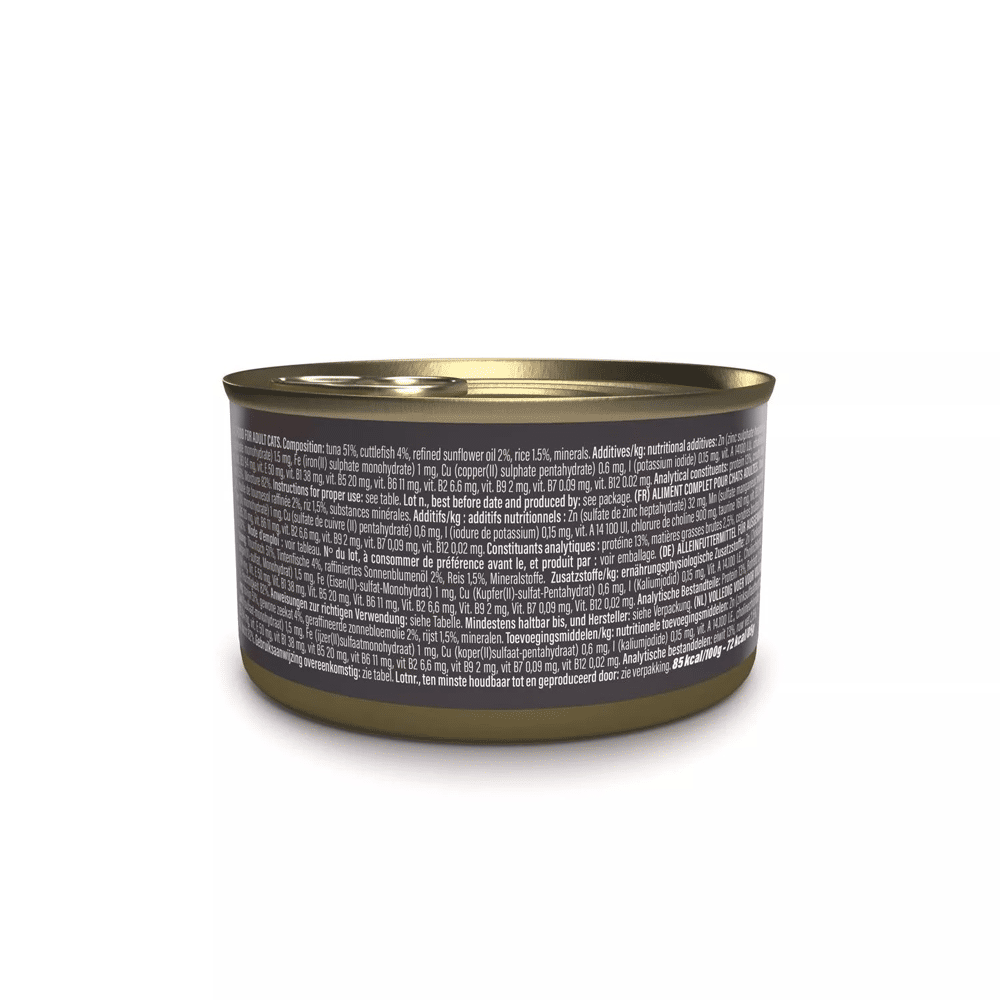 Samenstelling: tonijn 51%, inktvis 4%, geraffineerde zonnebloemolie 2%, rijst 1,5%, mineralen