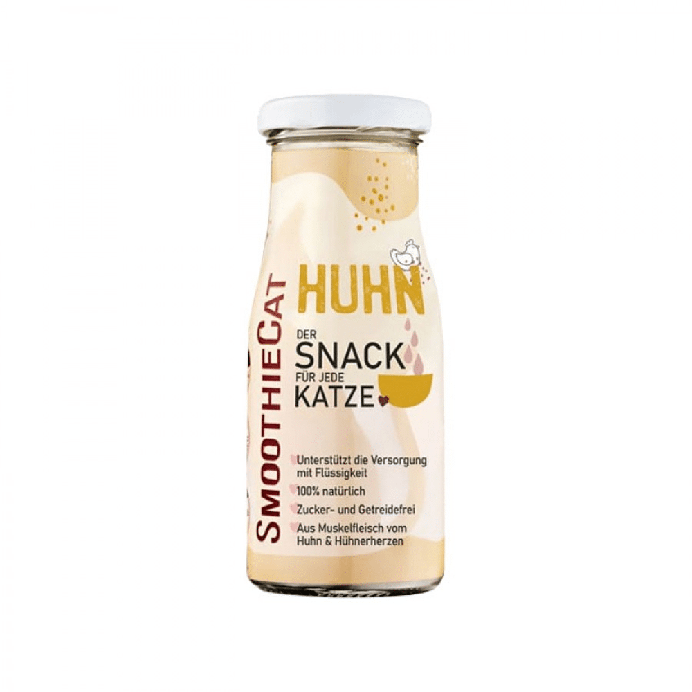 SmoothieCat is de vlezige smoothie voor katten gemaakt van kip en kippenharten. Pluimvee heeft veel voordelen in de voeding van katten: het is zeer mager, licht verteerbaar en heeft uitstekende voedingswaarden die bijdragen aan een gezonde lichaamsfunctie. Kippenharten behoren tot ingewanden maar ook tot spiervlees omdat kippenharten uiteindelijk puur spiervlees zijn. Met een laag vetgehalte en de taurine die ze bevatten, zijn ze een heerlijke en belangrijke traktatie voor katten. Katten houden meestal erg van de smaak van de gekookte en gepureerde wortelen en worden zo voorzien van caroteen, vitamine E, vitamine B6, B12 en B2 en het immuunsysteem wordt versterkt. Wortelen hebben een antioxiderende werking tegen vrije radicalen, waarvan bekend is dat ze kankerverwekkende celbeschadiging veroorzaken. Door hun vezelrijkheid stimuleren wortelen de spijsvertering en dragen ze bij aan de werking van de darmen.