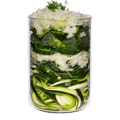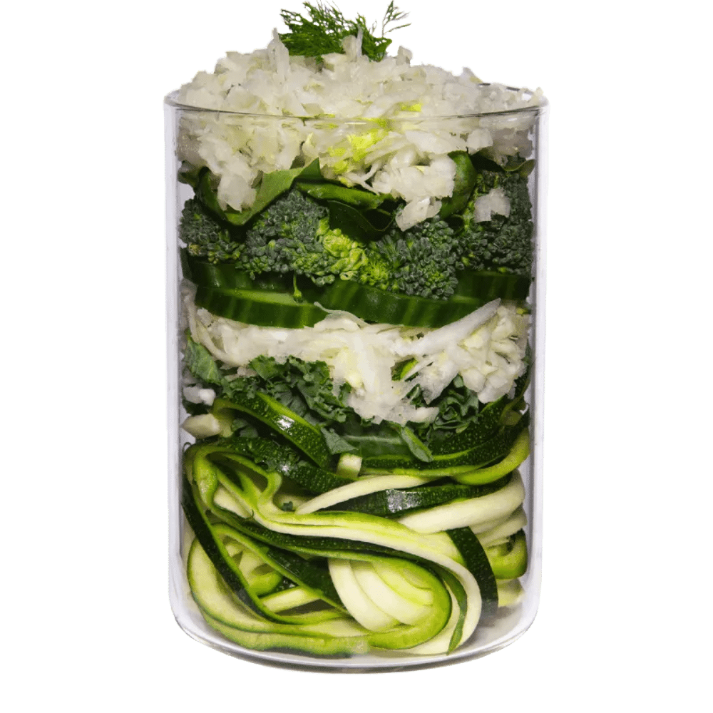 courgette (18 %), selderij (18 %), broccoli (18 %), komkommer (9 %), spinazie (9 %), venkel (9 %), groene appel (9 %), boerenkool, biergist*, paardenbloem* (0.2 %), basilicum* (0.2 %), wilde knoflook* (0.2 %), artisjokblad* (0.1 %), brandnetel* (0.1 %), dille* (0.1 %), peterselie* (0.1 %), kervel* (0.1 %), kleimineraal*, zeewier*