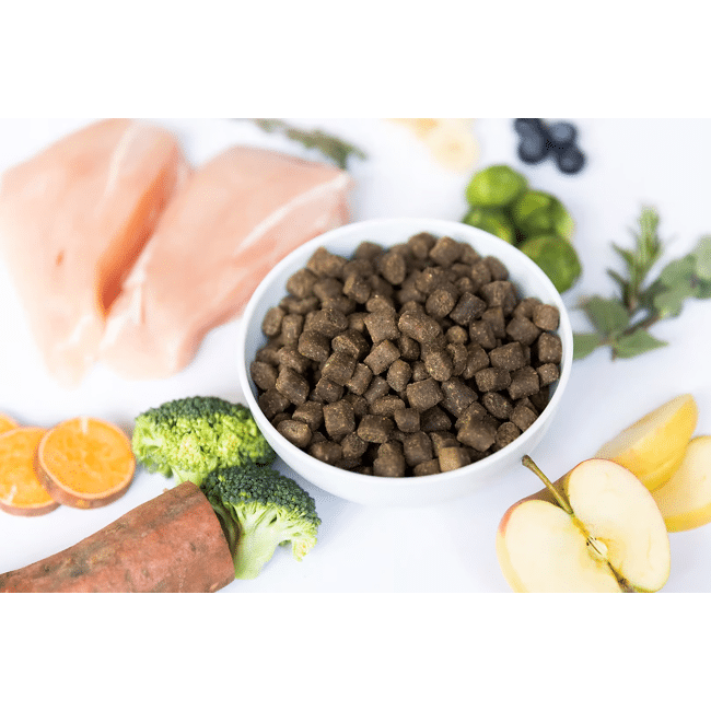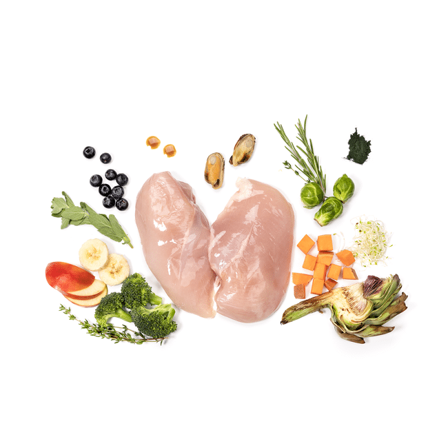 75% vers vlees en in het wild gevangen vis (45% kip, 15% sardines, 15% ansjovis), 20% zoete aardappel, 3% gezondheidsmix (banaan (4487 mg/kg), artisjok (4188 mg/kg), cichorei, luzerne (2991 mg/kg), appelen (2692 mg/kg), broccoli (2542 mg/kg), bosbessen (2393 mg/kg), spruiten (2094 mg/kg), groenlipmossel (1496 mg/kg), rozemarijn (1196 mg/kg), tijm (897 mg/kg), origan (598 mg/kg), mariadistel, spirulina, olijfolie, yucca), 1% forelolie, glucosamine (1000 mg/kg), chondroïtine (850 mg/kg), MSM (650 mg/kg).