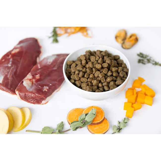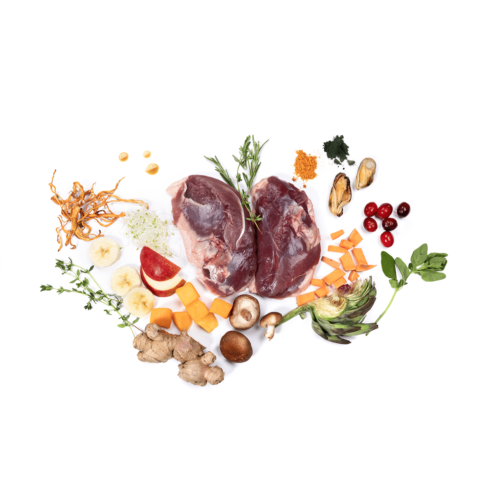 75% verse eend, 20% zoete aardappel, 3% gezondheidsmix: (banaan (5982 mg/kg), artisjok (4486 mg/kg), cichorei (4813 mg/kg), luzerne (2393 mg/kg), appels (2094 mg/kg), pompoen (1794 mg/kg), veenbessen (1495 mg/kg), groenlipmossel (1346 mg/kg), groene thee (1196 mg/kg), rozemarijn (1047 mg/kg), tijm (897 mg/kg), origan (748 mg/kg), mariadistel (269 mg/kg), spirulina (239 mg/kg), olijfolie (209 mg/kg), yucca, cordyceps (179 mg/kg), shitake, paardenbloem, gember, kurkuma), 1% forelolie, glucosamine (1000 mg/kg), chondroïtine (850 mg/kg), msm (650 mg/kg).