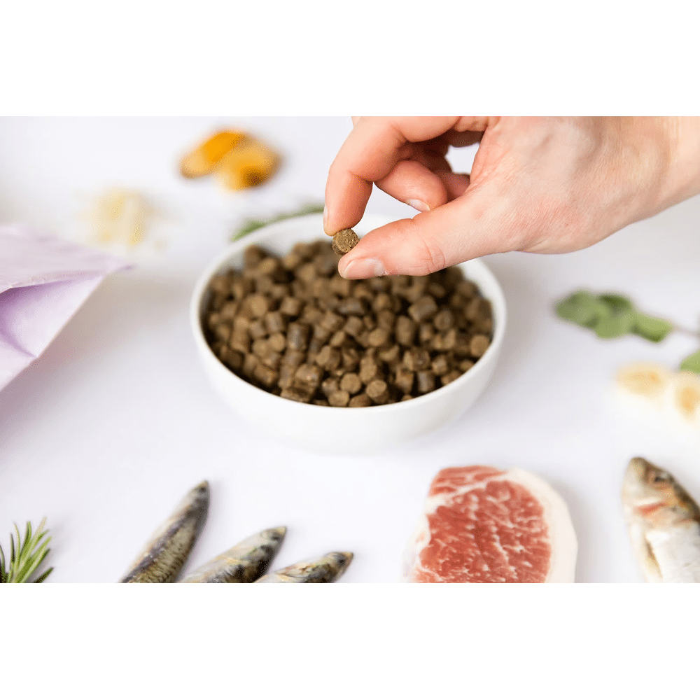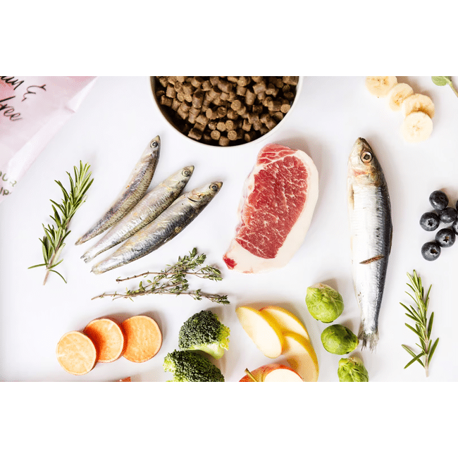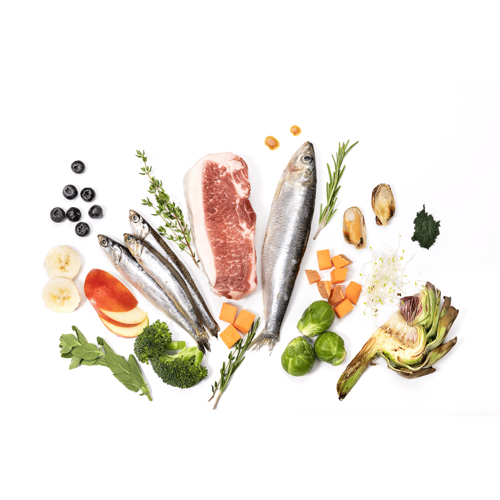 75% vers vlees en wild gevangen vis (45% varkensvlees, 15% sardines, 15% ansjovis), 20% zoete aardappel, 3% gezondheidsmix: (banaan (5982 mg/kg), artisjok (4487 mg/kg), cichorei, luzerne (2692 mg/kg), appelen (2542 mg/kg), broccoli, bosbessen (2333 mg/kg), spruiten (2303 mg/kg), groenlipmossel (598 mg/kg), rozemarijn (419 mg/kg), tijm (389 mg/kg), origan (359 mg/kg), mariadistel, spirulina (242 mg/kg), olijfolie, yucca), 1% forelolie, glucosamine (1000 mg/kg), chondroïtine (850 mg/kg), msm (650 mg/kg).